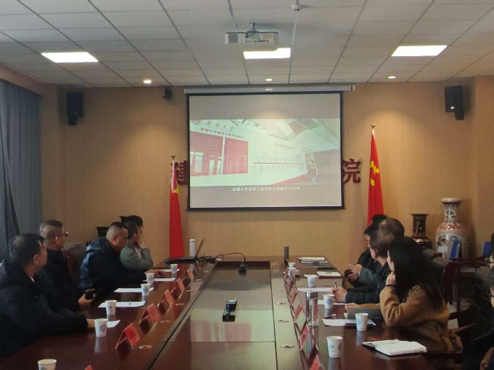 会议双方分别介绍了参会代表,学院通过宣传片展示了建工学院的发展历程、学科建设与科研平台概况。学院领导介绍了学院师资力量及在校生的基本情况,每位教师介绍了自己的研究方向,中防恒安集团董事长介绍了集团基本情况及在新疆开展的工程项目等。